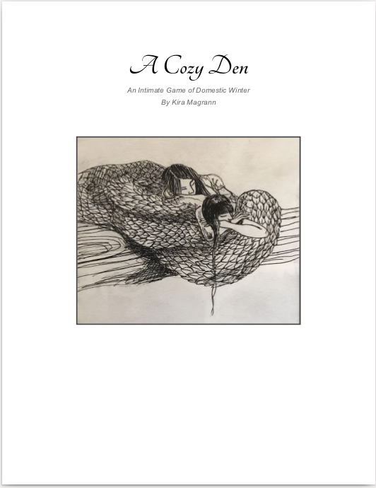 A Cozy Den is an intimate game of domestic winter. Players roleplay as Lesbisnakes who all have different needs in their Den and various ways of approaching these needs, from cuddling, to napping, to wrestling. Lesbisnakes are half snake, half human, and all lesbian. Various threats are waiting outside of the Den throughout winter putting stress on the Lesbisnakes feelings. Can the Lesbisnakes maintain a community of coziness during the overwinter time?