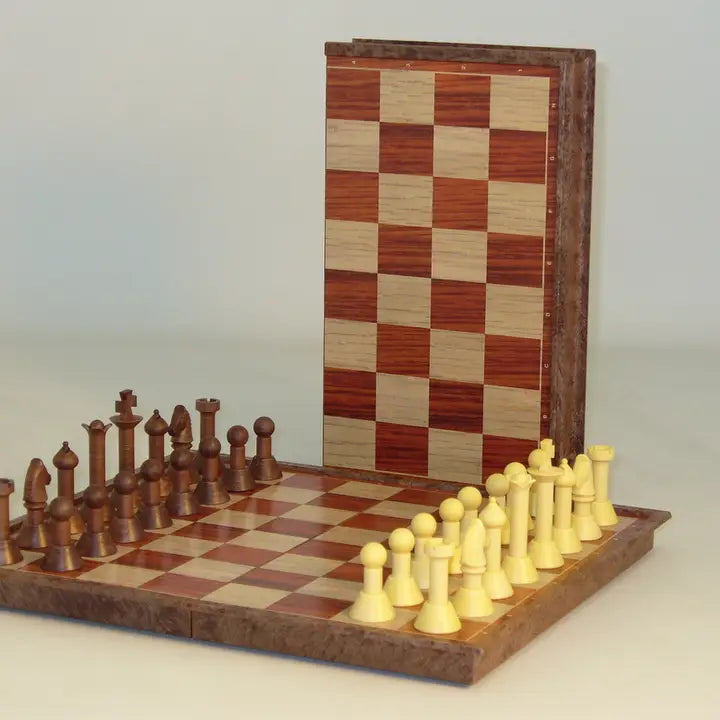 Plastic wood-tone tall chessmen on Metal wood-tone folding magnetic board 11" X 6.25" X 2" closed.