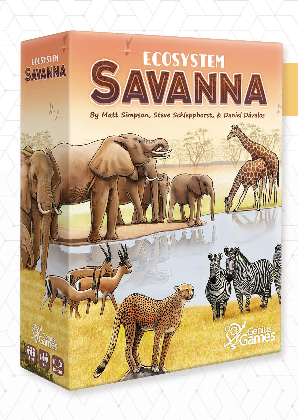 Be on the prowl in Ecosystem: Savanna, a Serengeti-inspired card-drafting game. Players choose, pass, and arrange cards representing a diversity of organisms found in an African grassland, including zebras, elephants, cheetahs, and lions. Earn points by aligning herbivores with habitable landforms like watering holes or placing carnivores to devour nearby prey. Diversify your food web to maximize your bonuses. Each time you play, you build a one-of-a-kind eco system as you strive to balance the delicate connections between all living things.