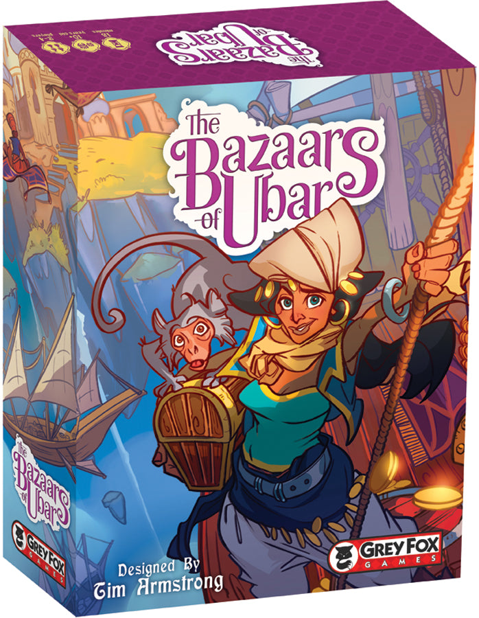 The Bazaars of Ubar is a fantastical engine-building game that takes players to the mythical marketplaces of Ubar - the Atlantis of the Sands! Draft trade tiles from a common area, paying for them with time, in a marketplace where the costs shift like the sands from game to game. Make clever use of tradewinds to activate your drafted tiles again and again. Manage the space on your ship to carry only the most precious cargo as you make your way to floating bazaars to sell your goods. Watch for fluctuating values in the markets to make sure your goods bring in the most gold and ensure your victory as the shrewdest trader in The Bazaars of Ubar!
