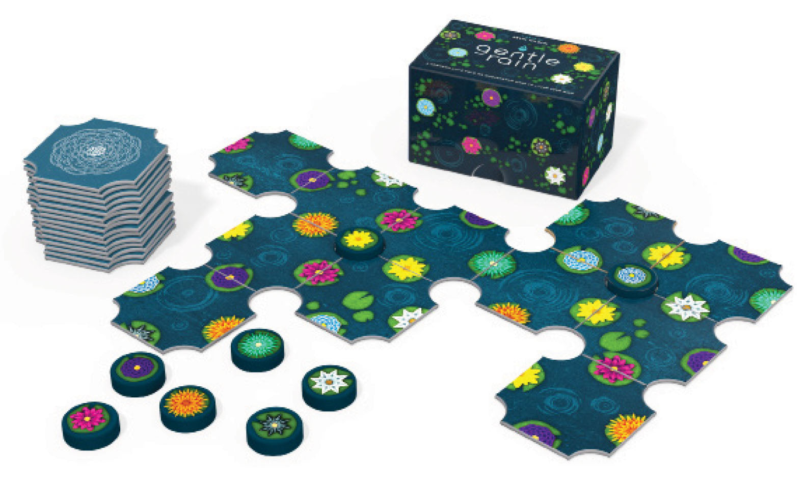 You have come to the lake hoping to see a rare and beautiful sight. The lilies of the lake only open their blossoms in the rain, and only rarely do all eight kinds of lily bloom at once. The goal of A Gentle Rain is to place the lake tiles in such a way to cause all eight types of lilies to bloom before you run out of tiles and the rain ends. Place each new tile you draw next to a tile already in play, making sure to match the colors of all the tile edges touching the tile you are placing. Each time you manage to complete a square of four touching tiles, a blossom opens between them. Keep Score, or don`t.