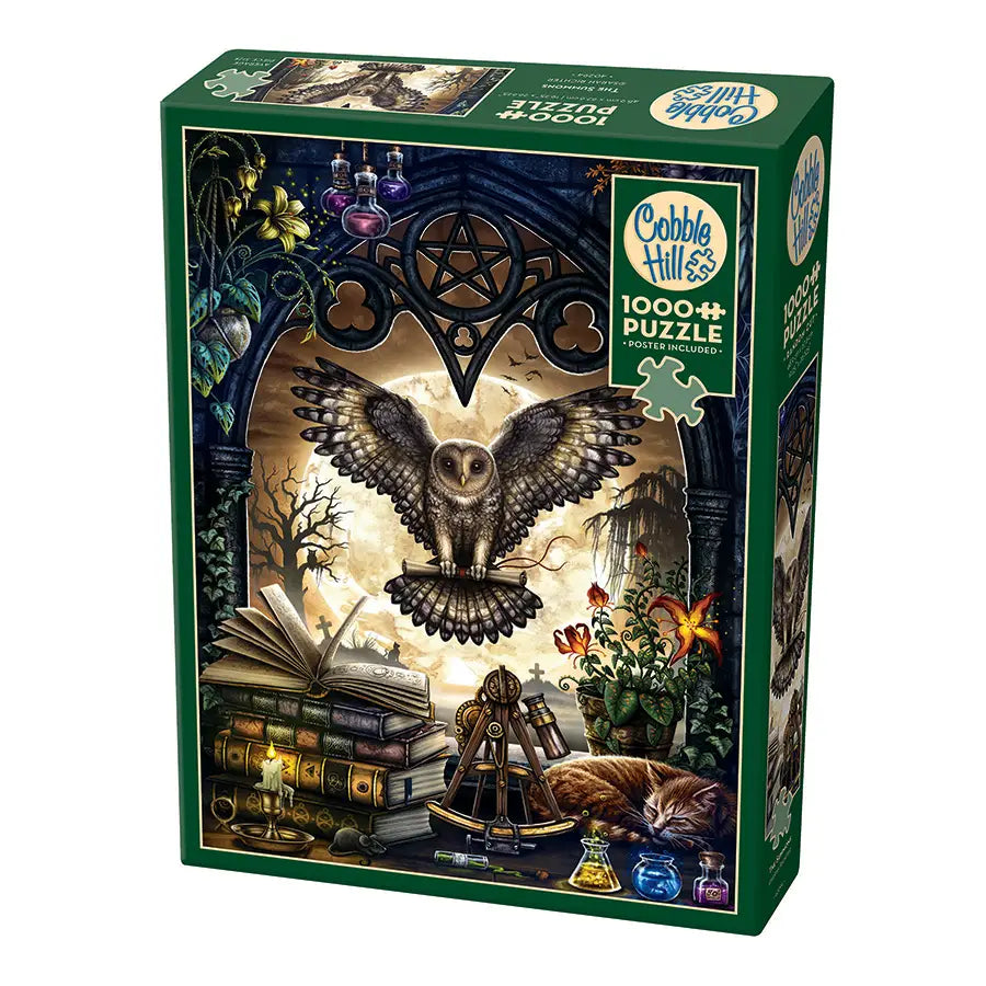 An arched window invites a mystic owl into its laboratory where potions have been concocted, tempting a curious mouse to investigate. Hopefully, it doesn't send him outside into the graveyard or it may require quick use from the stack of magic books to find a way to bring it back to this world. The Summons is a 1000 piece puzzle by Sarah Richter, licensed to Cobble Hill Puzzles. Made in the USA