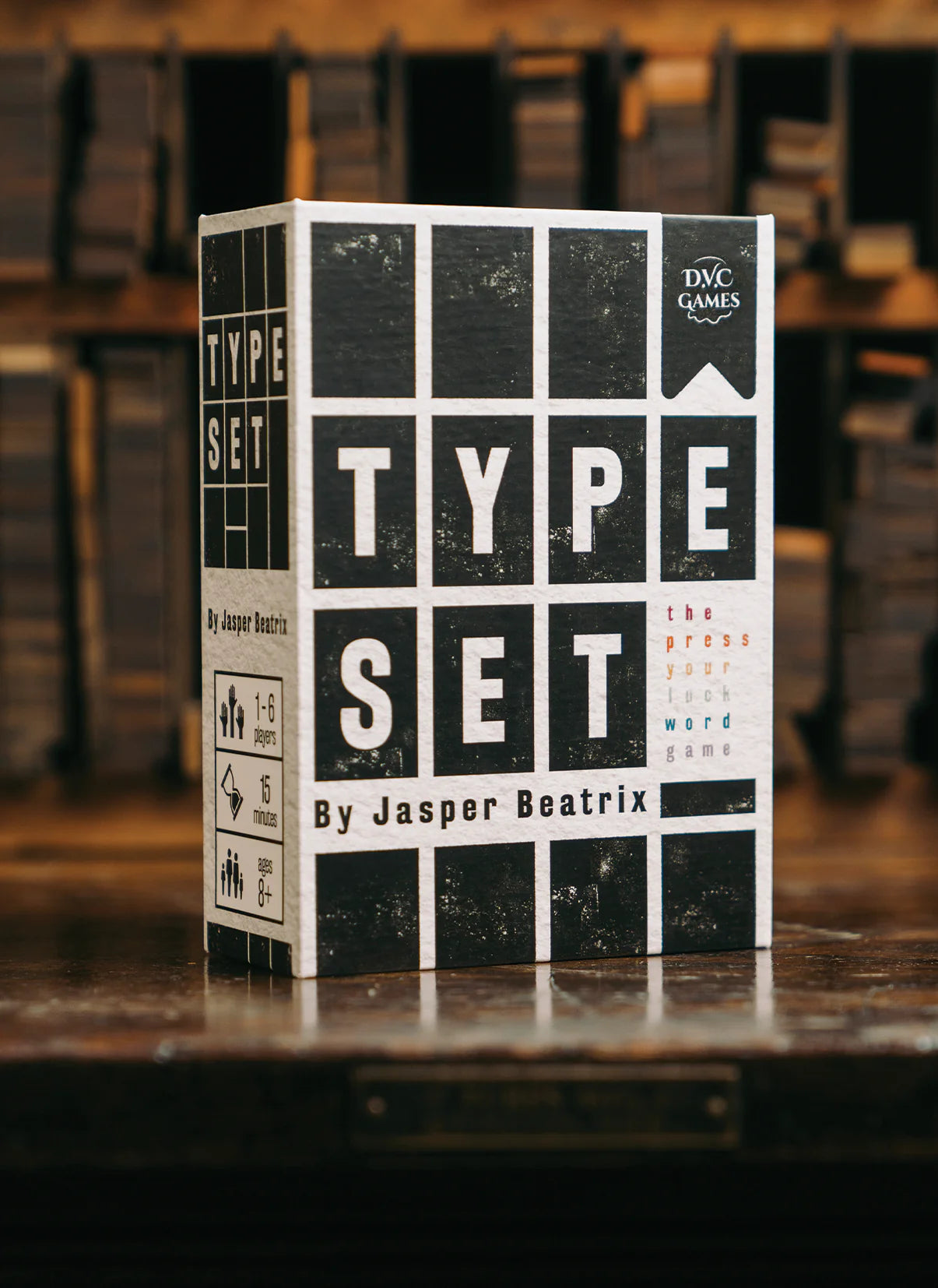 TYPESET is a love letter to the creativity and fluidity of words, as well as printmaking and typesetting tradition. Simply put: Place letters in order from left to right, using vowels as needed, to try to make the words as long as you can. Use wild letters and errors to manipulate your luck, and eventually declare you are finished... or push-your-luck with more letters.