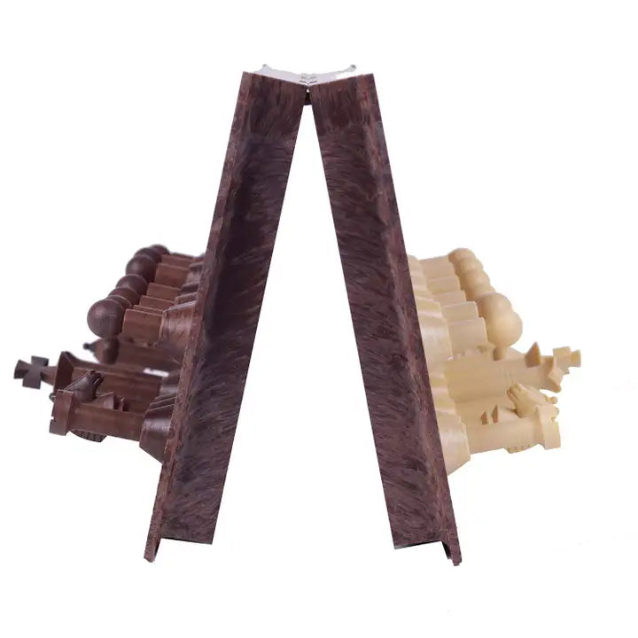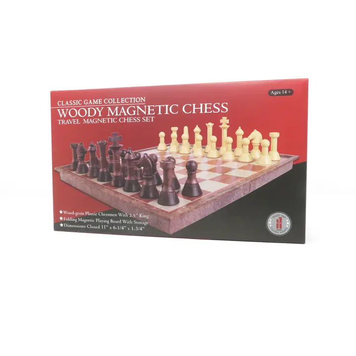 Woody Magnetic Chess Travel magnetic chess set with wood-grain plastic chessmen. Features a 2 ½” king and a 12 ½” x 11” folding magnetic playing board with storage. Dimensions closed 11” x 6 ¼” x 1 ¾”. Featuring a magnetic folding board and pieces, this chess set was built for on-the-go entertainment. Product Features Wood-grain plastic chessmen with a 2 1/2-in. king Folding design is easy to carry Pieces store inside folded board Product Details Includes: playing pieces & board 1.9"H x 6.8"W x 11.5"D