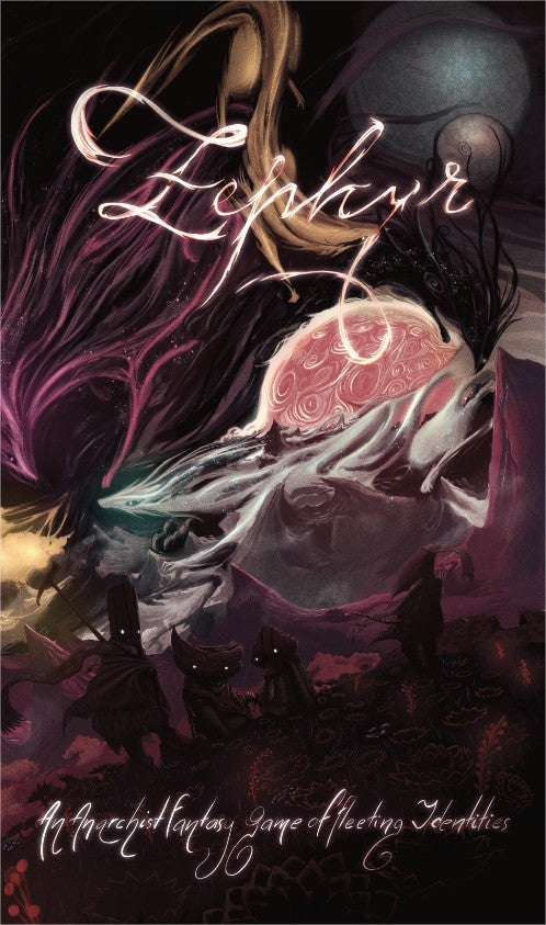 Zephyr: An Anarchist Game of Fleeting Identities is a roleplaying game set in the wandering, sentient continent of Ophoi. This entity travels on a relentless march across an endless salt flat, its four lungs bursting with sentimental energy - the alien emotions of the Zephyr, which comes in Cyan, Magenta, Yellow and Black. Like most substances, the emotions of the Zephyr coalesce into mountains made of rage, rivers of sorrow, fields grown out of the essence of guilt - everything that is, in its whole colorful gamut, including complex lifeforms. From these emotions and their fusion, the Windfolk are born. You are one of them, setting out from a far flung community in mountainous embrace, to travel this eerie continent in order to fulfill sacred Obligations. These Obligations are crafted by the players, becoming the main drivers for the narrative as well as the knots that tie your characters to the peoples they meet across the land. Venturing forth into the Living Landmass, you will hunt, cook, craft, and glide your way into the depths of the world - pushing each of your specialties in order to survive while trying to avoid the terrifying menace of the Salt States. The Zephyr Rulebook is a 250 page long journey of epic proportions, fully illustrated from the first to the last page, featuring a character creation process in comic book format (through which your character's identity will take shape based on their outlook on Windfolk myths) as well as Technologies, Patterns, and the full breadth of rules needed to make Ophoi come to life. Note: Zephyr uses cyan, magenta, yellow, and black tokens in order to play. I suggest around 25 tokens of each color to be well stocked for your game. |